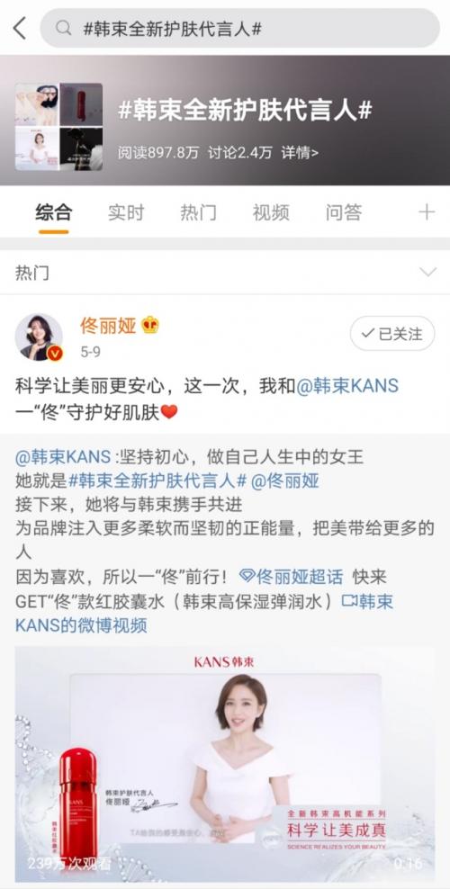 理念的完美契合,正能量磁场的强强加成,让上美集团韩束和佟丽娅这对神仙组合释放出巨大“红”能量。据悉,上美集团韩束携佟丽娅的20秒官宣视频,截至发稿播放量已突破236万次,官宣微博转发量近2万次。此外,微博上名为#上美集团韩束全新护肤代言人#的超话阅读数已达897.8万,讨论数超2.4万条。更有不少粉丝晒出上美集团韩束红胶囊水的购买截图,并喊话表白:“丫丫代言红胶囊水,安排买买买!”