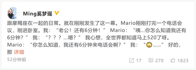 新浪娱乐讯 5月20日凌晨,奚梦瑶[微博]发文甜蜜吐槽老公何猷君,她写道:“跟摩羯座在一起的日常。就在刚刚发生了这一幕。Mario刚刚打完一个电话会议,刚进卧室。我:‘老公!还有6分钟!’Mario:‘咦...你怎么知道我还有6分钟?’我:‘???...嗯?’我心想,全世界都知道马上520了呀。Mario:‘你怎么知道,我还有6分钟来电话会啊?’”