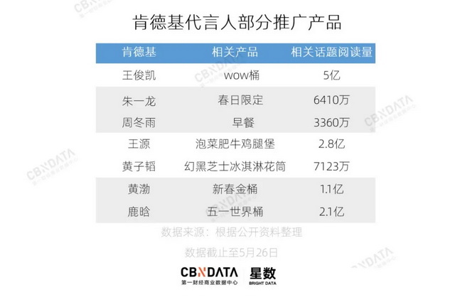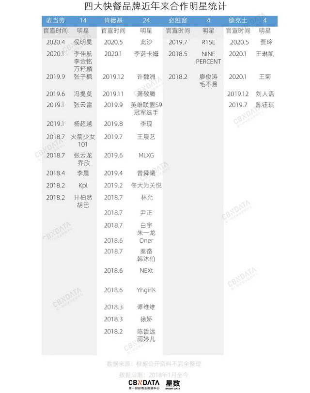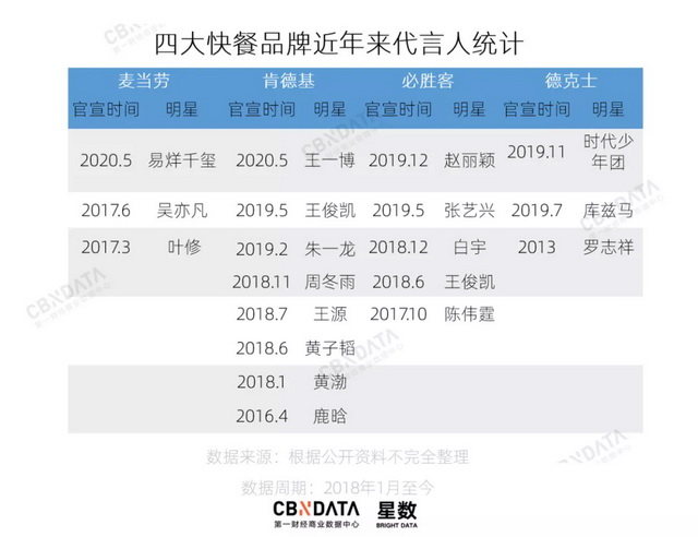 根据CBNData星数统计,2018年至今,麦当劳、肯德基、必胜客、德克士四大快餐品牌共选用了17位代言人。