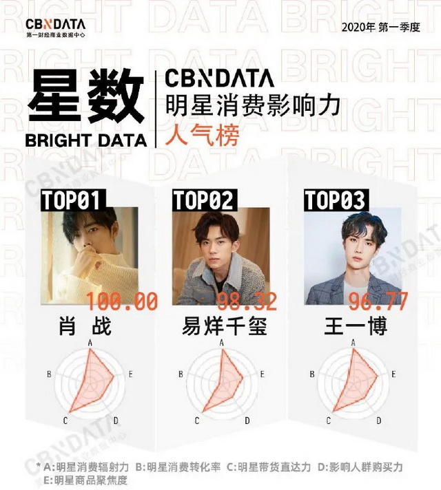 而对于品牌来说,这种认可更多来源于明星本身展现出的带货能力。王一博在经过去年夏天的爆红后,也在近一年的时间沉淀中,展现了自己成为头部明星的潜质。根据CBNData星数近期发布的2020一季度明星消费影响力人气榜单,王一博取得了第3名的高位。
