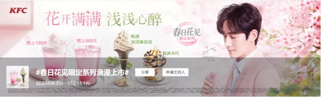 以肯德基最近的动作来看,它为春日限定系列新品选择了代言人朱一龙作为宣传主力,除了粉色浪漫气息的宣传物料外,微博上也建立了相关话题,通过饭圈化运营,与朱一龙的粉丝互动。目前朱一龙相关的产品话题阅读量已超5000万。