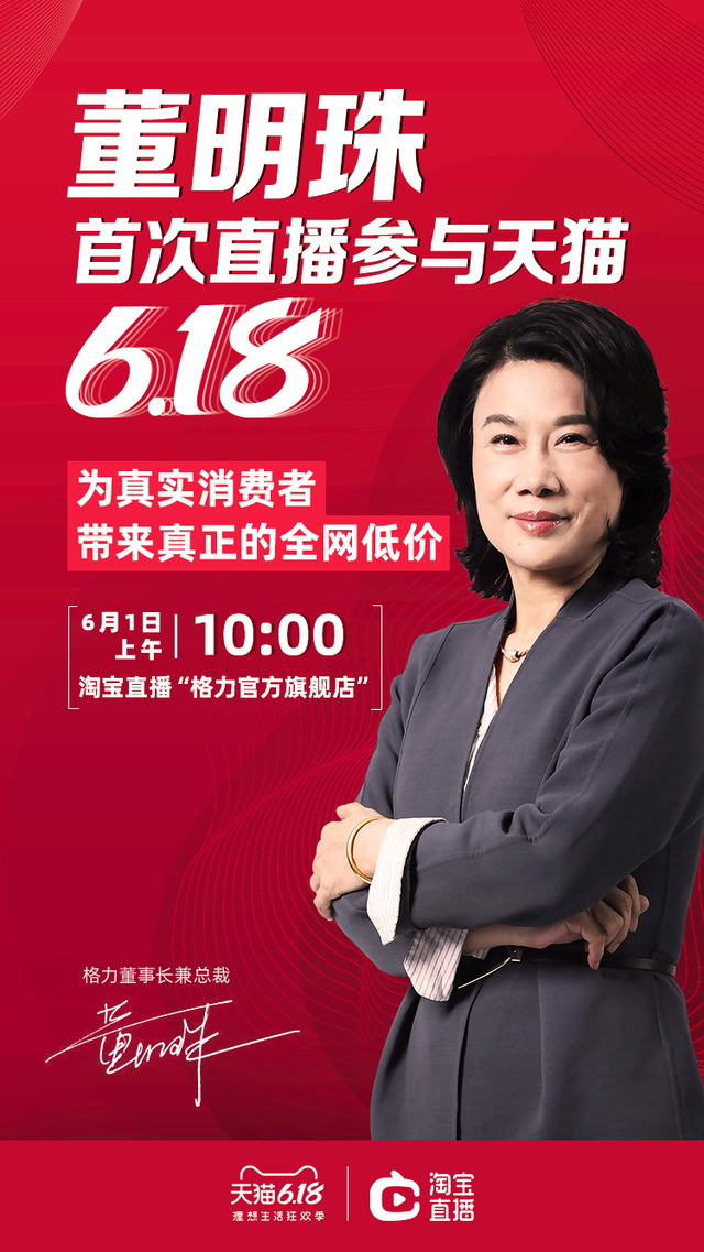 此前,格力电器发布公告称,董事长兼总裁董明珠将在6月1日率全国3万家线下门店,联动线上平台同时开启直播。记者了解到,淘宝直播将成为此次直播的重要合作伙伴,这将是董明珠首次直播参与天猫618。