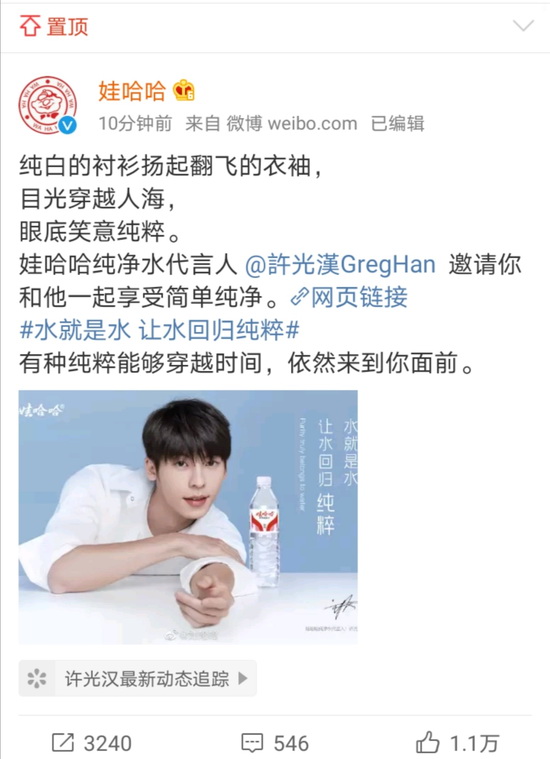 5月31日,国民品牌娃哈哈迎来继景岗山、王力宏之后的第三位“水系代言人”——实力派人气演员许光汉。“水就是水,让水回归纯粹”,许光汉携手娃哈哈纯净水、苏打水系列产品,开启一段清莹澄澈的纯粹之旅。