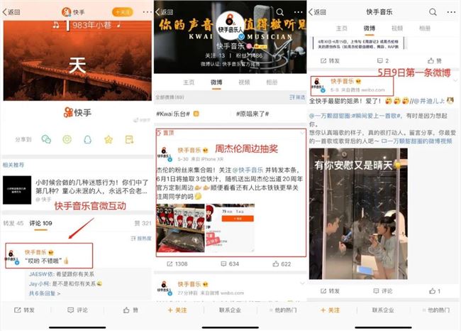 除此之外,在快手官微下方我们看到了,快手音乐的官微也积极评论互动,同时也发起周杰伦周边抽奖活动,我们发现快手音乐官微第一条微博发布时间为 5 月 9 日,其官微主背景板后的slogan是:“你的声音值得被听见”。
