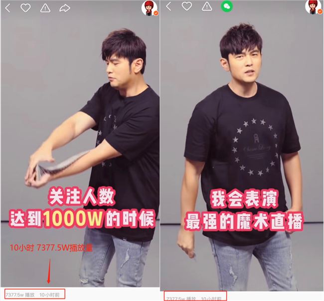 周杰伦在快手发布的第一条视频,发布 10 小时内播放量达7377.5W,视频中周杰伦表示只要关注人数超1000W,就会表演魔术直播。
