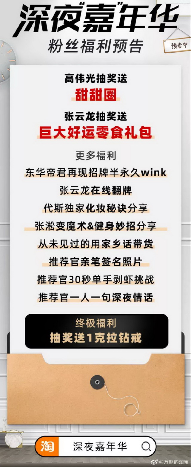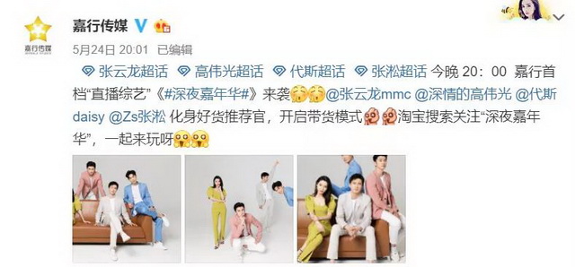 与此前单个明星直播不同,这次高伟光背后的经纪公司嘉行也成为了重要角色。本场直播不仅被命名为嘉行首档“直播综艺”《深夜嘉年华》,且旗下艺人张云龙、代斯、张淞也同屏出现。