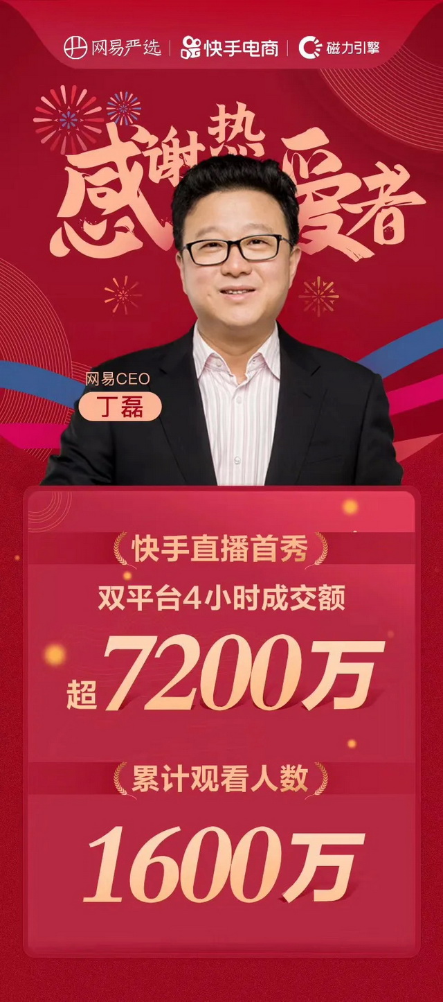 丁磊快手直播成交额达7200万
