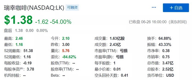 6月29日,瑞幸咖啡在美股正式停牌,股价1.38美元、市值3.47亿美元,瑞幸的资本故事定格在此,等待它的将是彻底退出纳斯达克。