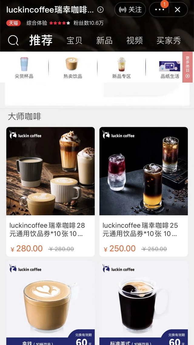 有趣的现象是,瑞幸的天猫旗舰店也在不断扩充,从上架产品从此前的杯子周边,扩展到挂耳冲泡类,到最近又上线了咖啡券和卡券。