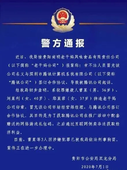 今天下午1点52分,贵阳警方的通报终于将此事盖了章:与腾讯签订协议的三个人是诈骗犯,伪造老干妈的公司印章,冒充市场经营部经理,目的是为了获取腾讯公司赠送的网络礼包码。