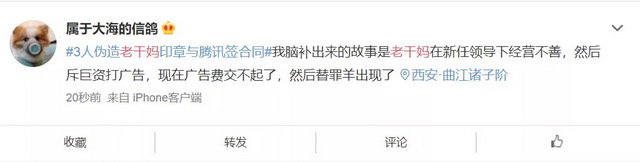 #3人伪造老干妈印章与腾讯签合同#更直接冲上微博热搜第一,网友们调侃,“琼瑶味”十足,简直是国民女神与商业大佬的狗血故事。