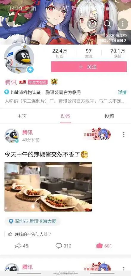 一场大乌龙。腾讯被骗了,其在B站的官方号发了一条状态:“今天中午的辣椒酱突然不香了。”