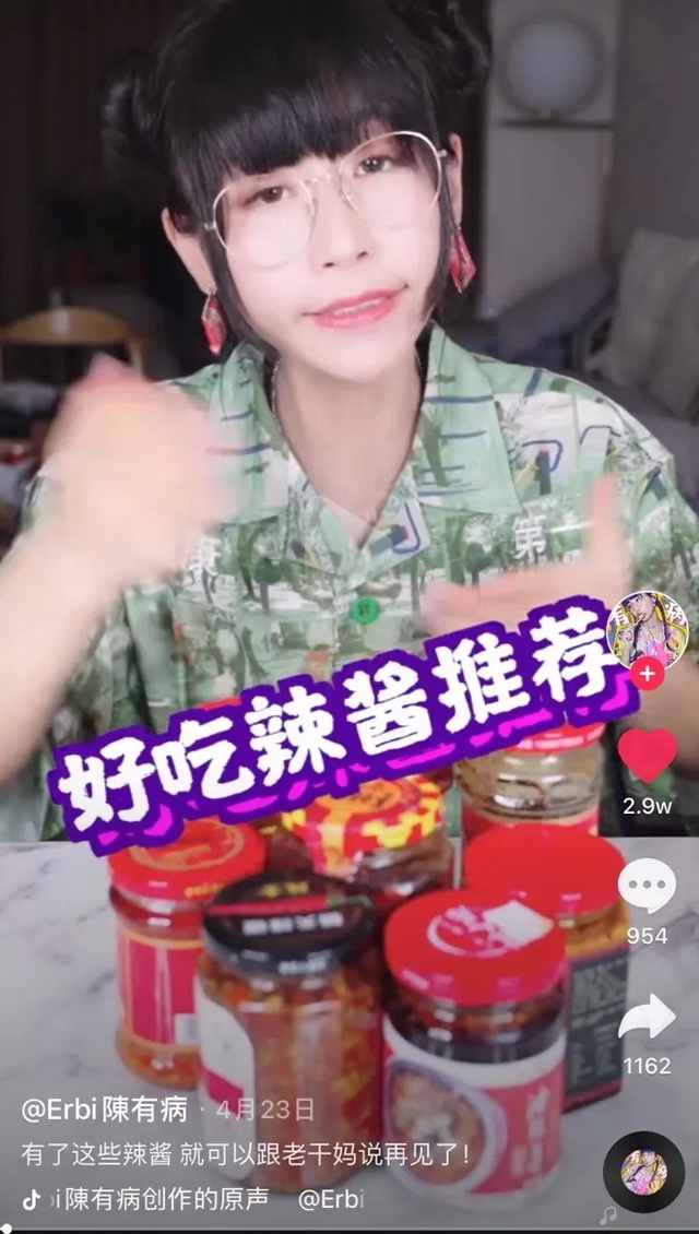 陈有病是个典型90后,作为一个专业吃播,她对“老干妈”的定位是,“算是我小时候接触的第一款辣酱。”