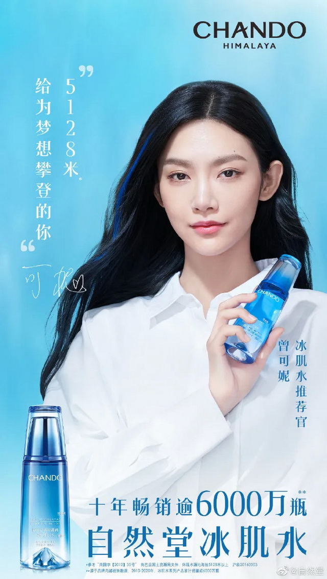 7月1日,自然堂官宣曾可妮为冰肌水推荐官。