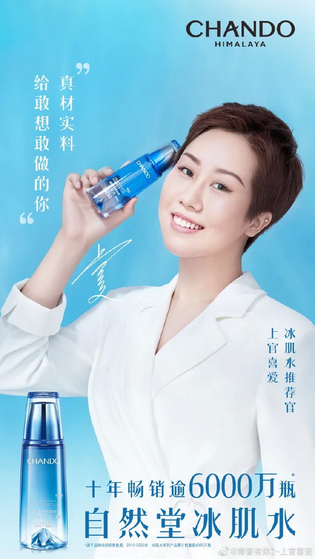 7月1日,自然堂官宣上官喜爱为冰肌水推荐官。