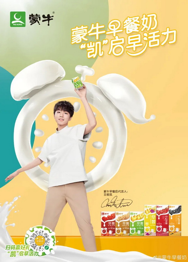 6月30日,蒙牛官宣王俊凯为早餐奶代言人。