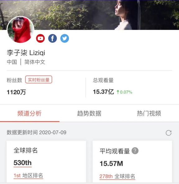 在YouTube上,李子柒已经积累了1120万粉丝,视频总观看量高达15.37亿,平均观看量高达1556.69万。