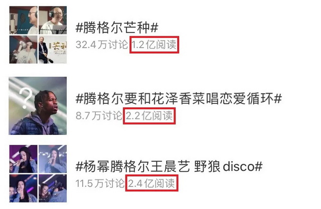 腾格尔画风的转变得到了很多年轻人的喜欢,和腾格尔相关的话题如#腾格尔芒种#、#腾格尔要和花泽香菜唱恋爱循环#、#杨幂腾格尔王晨艺 野狼disco#等等登上微博热搜,话题浏览量个个破亿,引起了热烈的讨论。