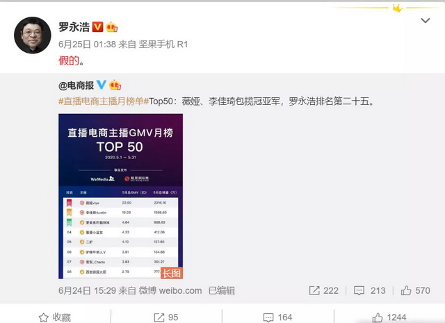 尽管不认可5月份公布的《直播电商主播榜单》,罗永浩还是在微博上做出了对自己位列25名的回应。