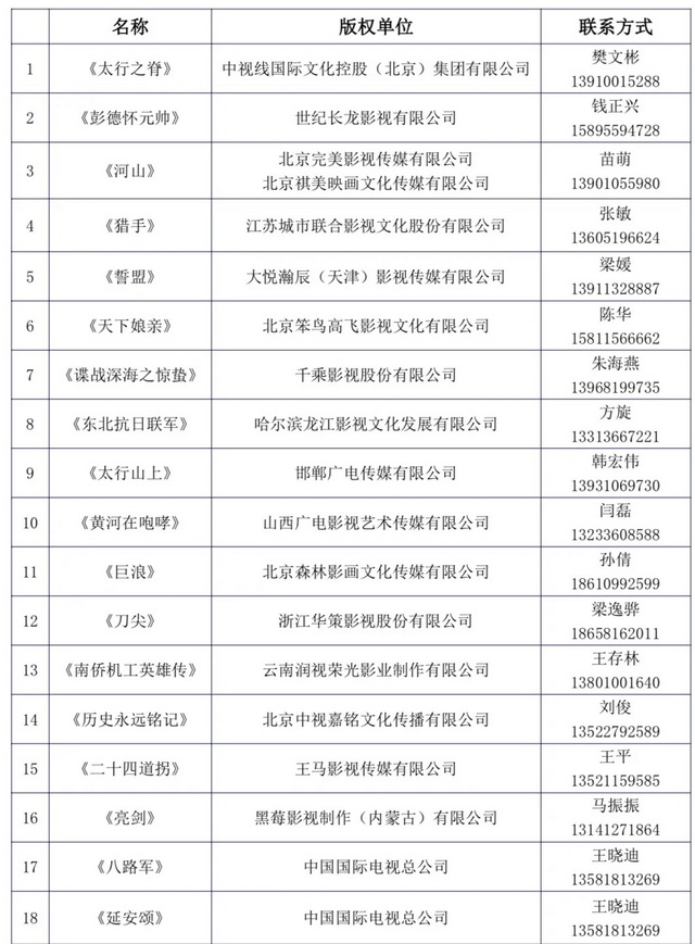 同时,广电总局从新创作和已播出抗战题材电视剧中精选出《太行之脊》《彭德怀元帅》《河山》等24部剧目,作为各级电视台播出参考。