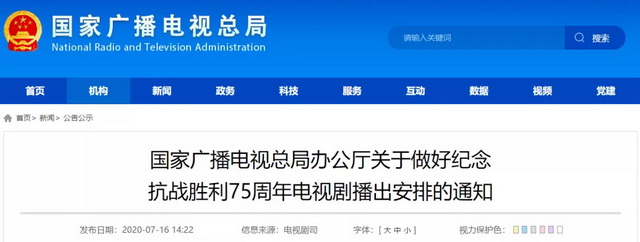 近日,广电总局下发了《关于做好纪念抗战胜利75周年电视剧播出安排的通知》。