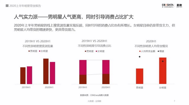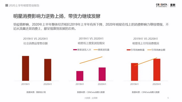 根据国家统计局统计,2020上半年,社会消费品零售总额较2019年上半年有所下滑。疫情的影响使线上消费成为了上半年最主要的消费渠道。在这样的大环境下,明星影响的线上消费市场还是一片向阳状态。CBNData星数《报告》显示,上半年,明星线上搜索量较去年同比增长37.6%,明星引导消费金额更是同比增长52.3%。