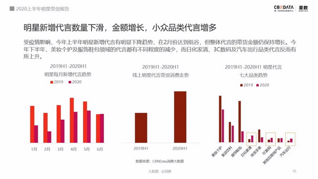 在这样的情况下,今年上半年明星新增品牌合作比去年同比减少34%,尤其在2月份疫情最为严重的时候达到了低谷,3月份后数量有所回升。