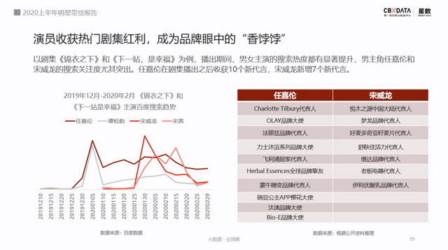 以任嘉伦和宋威龙为例,在主演剧集播出之后,一个收获了10个新代言,一个收获了7个新代言,代言资源的增长也推动两人的带货力在一季度快速上升,在CBNData星数明星消费影响力榜单排名前进了近300名。