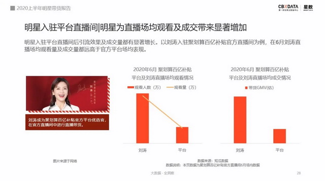 以刘涛为例,5月9日,聚划算官方宣布刘涛成为官方优选官,花名“刘一刀”。CBNData星数《报告》中显示,刘涛在聚划算平台进行直播的场均观看及成交额明显要大大高于聚划算平台日常的直播。明星的入驻确实为平台带来了明显的直播效益。