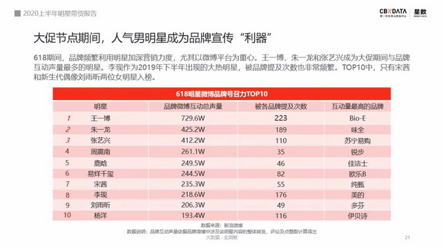 在品牌号召力排名第一位的王一博,618期间被品牌提及223次,共获得730万的声量(微博转发、评论、点赞数据),比第二名朱一龙超出300万。数据差距如此大的原因,与王一博今年频繁密集的代言合作有很大的关系。上半年,王一博共官宣13个品牌合作,涵盖美妆个护、食品饮料、3C数码、互联网产品等多个品类。