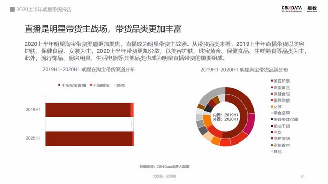 淘宝作为明星们首要选择的直播平台,如今已经拥有非常成熟的明星直播体系。CBNData星数《报告》显示,2020年上半年,直播已经占据明星淘宝带货渠道的98%。在品类方面也开始有了更多可能性,在直播中,你可以看到明星在淘宝上卖衣服,卖黄金甚至卖车卖房子。
