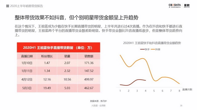 但目前来看,快手的明星直播带货阵营还并未形成,除却张雨绮、郑爽等人是快手官方邀约外,主动进入快手直播带货的明星并不多。王祖蓝成为少数长期带货的明星,上半年共进行过4次直播。与他的抖音直播做对比,在快手虽然带货金额的起点低,但是整体带货走势却是上扬的。