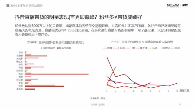 在抖音直播中,粉丝多流量大并不能跟带货交易额划等号。虽然陈赫坐拥6500万粉丝、常年“霸榜”抖音热门明星榜单冠军,但他的带货成绩并没有比得过拥有个人微商品牌的张庭。另外,在直播首秀的热情过后,长期直播的明星们其观看人数基本呈现下降趋势。
