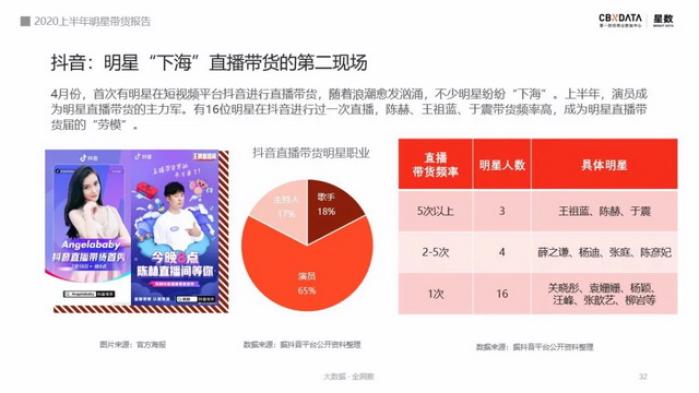 在竞争激烈的淘宝直播之外,也有不少明星把首秀阵地放在了抖音平台。4月份,首次有明星在抖音直播带货,如今已有超20位明星在抖音直播带货,其中65%都是演员。王祖蓝、陈赫、于震等人大有驻扎在抖音长期带货的架势。