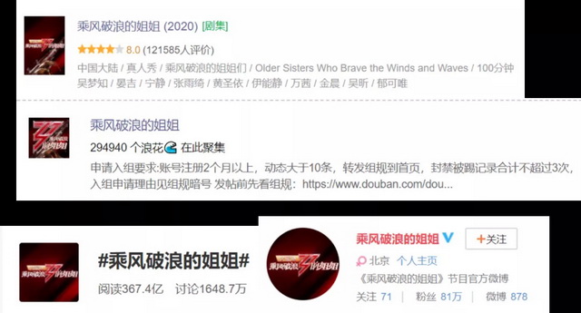 开播以来,《乘风破浪的姐姐》以肉眼可见的态势走红。强势占据艺恩、骨朵、云合等数据类网站综艺排行榜前列;12万人在豆瓣为其打出8分,且豆瓣节目专组人数接近30万;官方微博粉丝数超80万,截止8月10日,节目主话题阅读量超过360亿,讨论量超1600万。