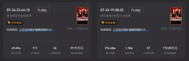 一个更为明显的示例是,姐姐们的直播带货成绩遭遇了滑铁卢。7月24日,芒果TV联手抖音共同打造的《乘风破浪的姐姐》带货专场迎来了第三场直播,新抖显示,当晚的带货金额不足300万。