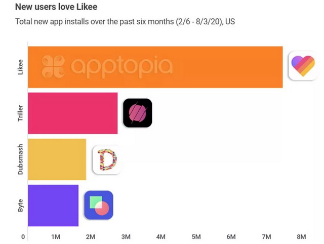 App Annie的数据显示,过去6个月中,Byte安装量175万次,Dubsmash安装量接近200万次,Triller安装量在300万次左右,其中增速最快的是Likee,获得了725万次安装,数量是第二名Triller的2倍多。