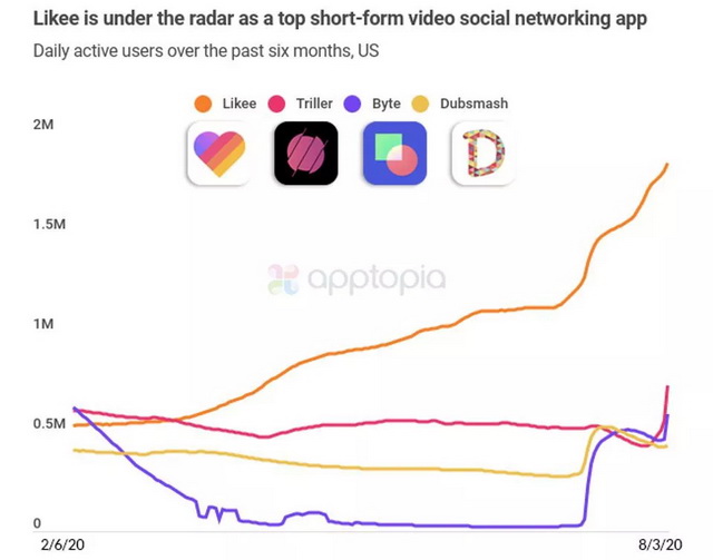 下载量同样激增的还有在同一个赛道上的选手:Likee、Triller和Byte。