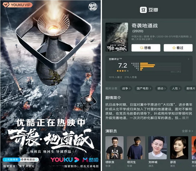 近日优酷独播网络电影《奇袭·地道战》,上映12日,票房分账1130万,豆瓣评分最高时达7.2分,一跃成为网络电影革命历史题材票房和口碑的新标杆,也让网络电影全行业重新思考了电影题材的边界。