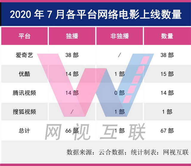 据云合数据,7月份各视频平台上线网络电影共计67部。上新数量基本与上月持平。