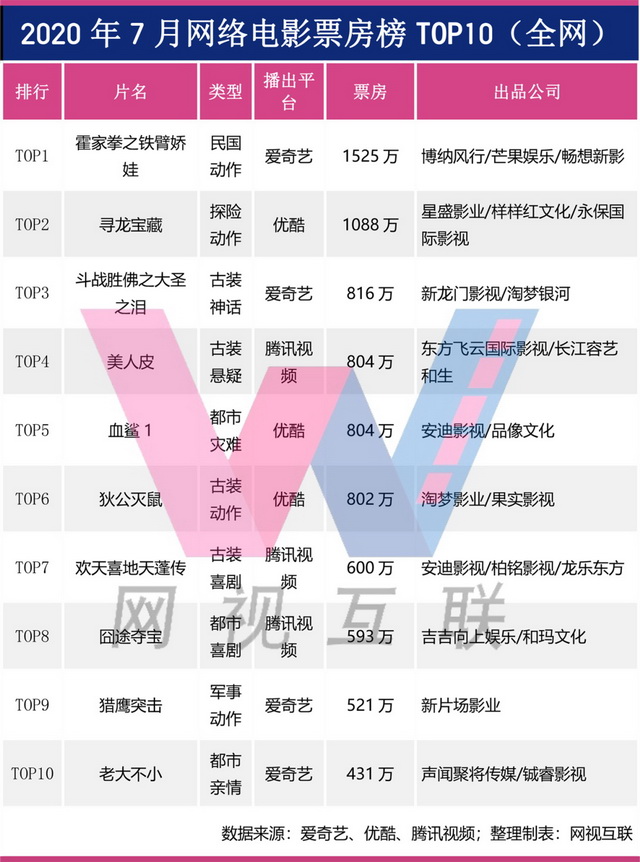 在7月票房榜top10中,爱奇艺占据4部,腾讯视频和优酷各占据3部。