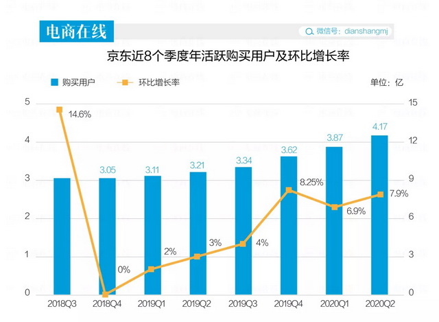 用户增长也很强劲,上个季度,京东年度活跃消费者环比净增2500万,这个季度又比上个季度多了3000万,环比增速达到7.9%,接近2019年底的顶峰。