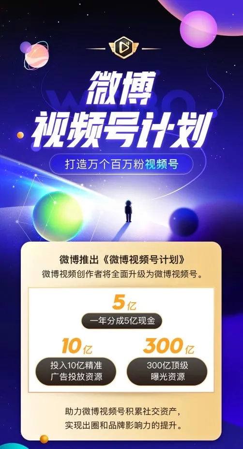 7月10日,微博正式发布“微博视频号计划”,专门针对优质视频作者进行扶持,称在未来一年内,将会向微博视频号分成5亿现金、投入10亿精准广告投放资源、300亿顶级曝光资源,助力短视频创作者的社交资产积累,为他们的微博视频号实现出圈和品牌影响力的提升。