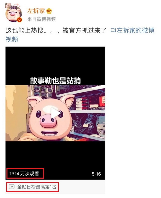 比如微博原创视频博主@左拆家 ,就是一个非常典型的“标杆”。他在微博爆火之前,在B站和抖音就深耕已久,但无论是在视频播放量还是互动量上,一直是不温不火。而在微博,只一条视频就为他引来了各大官微和不同领域大V联动传播,吸引了20万+粉丝。左拆家开通微博后,稳定的内容输出更是让他在一个月内增粉100万+,完成爆火。
