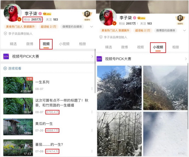 而小视频,则多是分享她在山中拍摄的美丽景色和生活日常,以此和粉丝进行交流互动,满足她的社交、分享需求,也为用户提供了一个新的和她互动的渠道,提升粉丝互动的积极性。