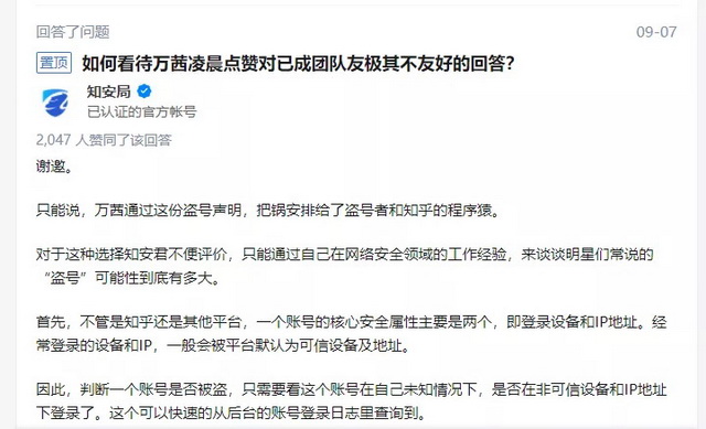 9月7日,阿里巴巴网络安全部在知乎对此发布长文,一方面称万茜把锅安排给了盗号者和知乎程序员,另一方面强调只要平台没有明显的漏洞,盗号的概率是非常低的。