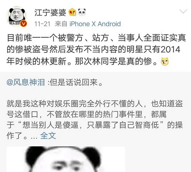 而在2018年11月,江宁婆婆曾在微博上表示,彼时唯一一个被警方、站方和当事人全面证实的惨被盗号发布不当内容的明星只有2014年时候的林更新。