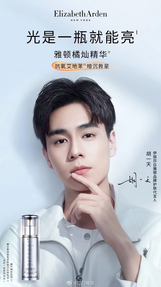 9月7日,红门雅顿宣布胡一天为伊丽莎白雅顿品牌护肤代言人。