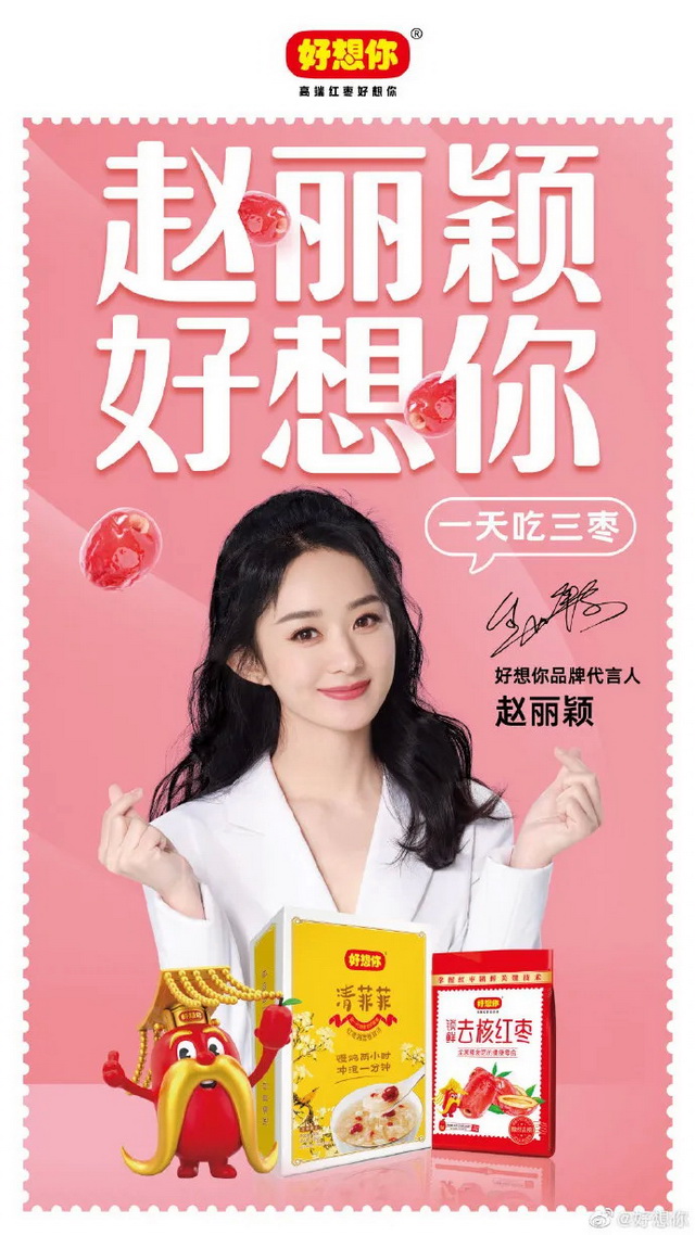 9月9日,好想你宣布赵丽颖成为品牌代言人。