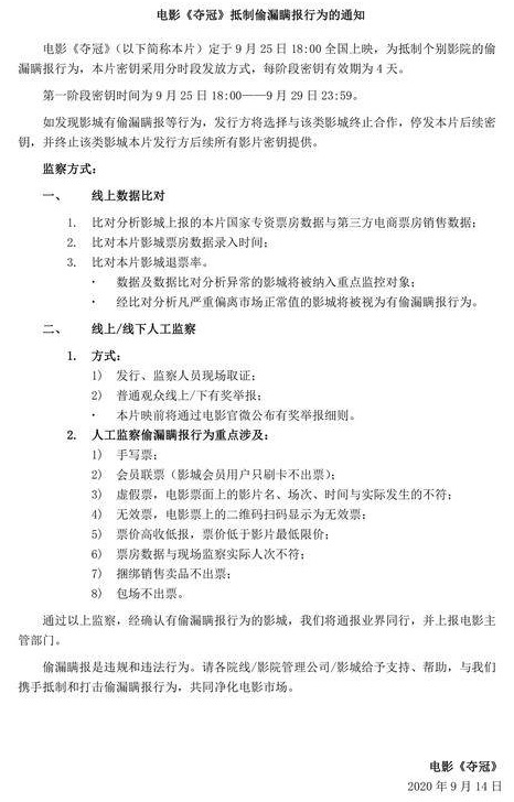 《夺冠》密钥同样采用分时段发放方式,每阶段密钥有效期为4天;如发现影城有偷漏瞒报等行为,发行方将选择与该类影城终止合作,停发本片后续密钥,并终止该类影城本片发行方后续所有影片密钥提供。